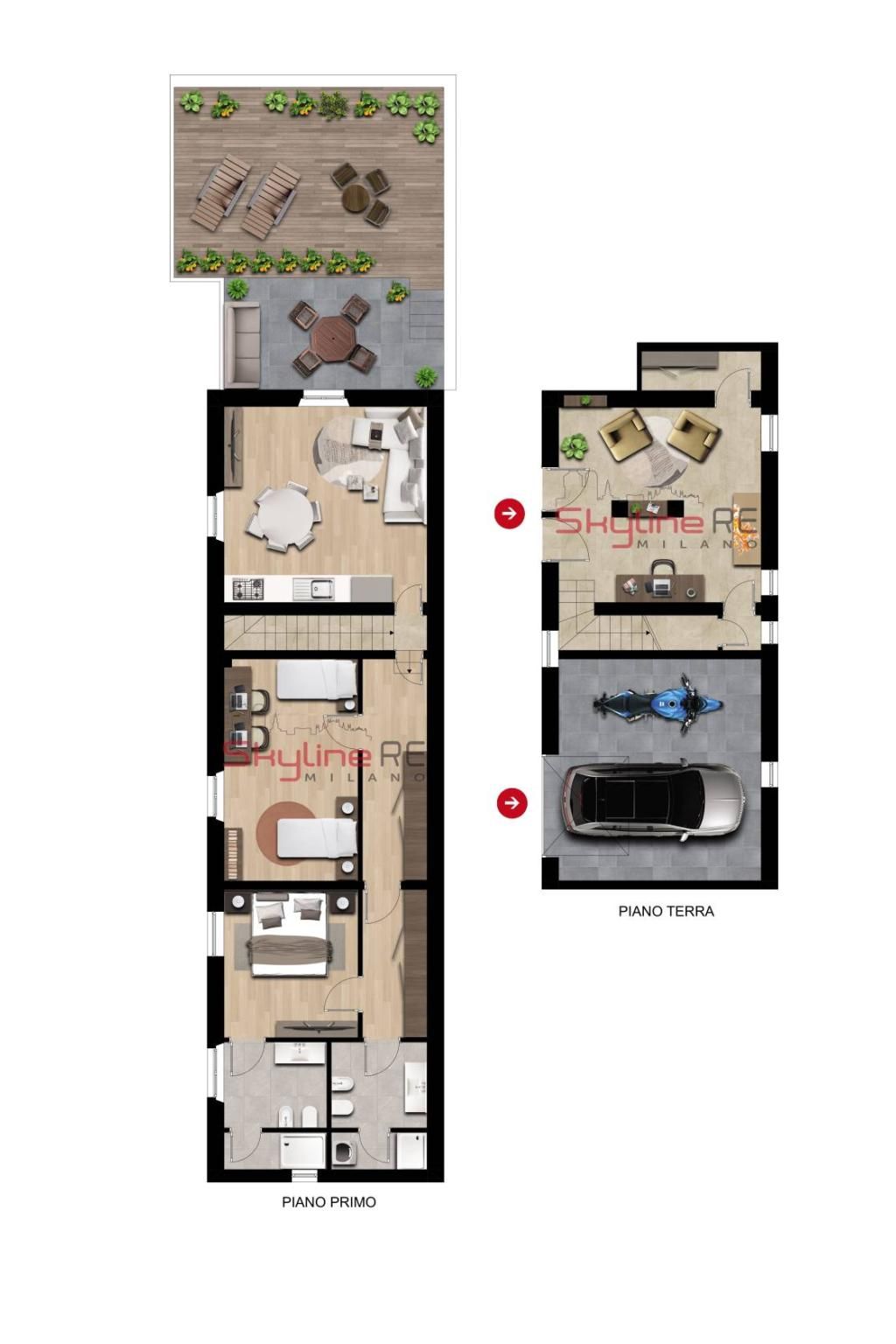 TRILOCALE INDIPENDENTE RISTRUTTURATO CON TERRAZZO MQ 45 DOPPI SERVIZI BOX DISPONIBILE DAL 15/07/2026. Nel cuore di Brera, all'interno dei cortili di Via Palermo 5, proponiamo una raffinata soluzione indipendente su due livelli, completamente ristrutturata e impreziosita da un terrazzo di circa 45 mq. L'ingresso ci accompagna ad un contesto di grande fascino, dove i dettagli d'epoca, colonne in granito, camino originale, soffitti in legno con travi a vista e pavimentazioni storiche, dialogano armoniosamente con il comfort moderno. Al piano primo si sviluppa un accogliente soggiorno con cucina a vista, affacciato sul terrazzo, ideale per momenti conviviali in un'atmosfera riservata e silenziosa. La zona notte comprende due camere da letto, di cui una con bagno en suite, un secondo bagno, una lavanderia e una cantina collegata internamente. Parquet nel living e nelle camere, gres porcellanato nei bagni, infissi con doppio vetro. Impianti completamente nuovi, riscaldamento autonomo e aria condizionata. Completa la proprietà un box. Disponibile dal 15/7/26.
